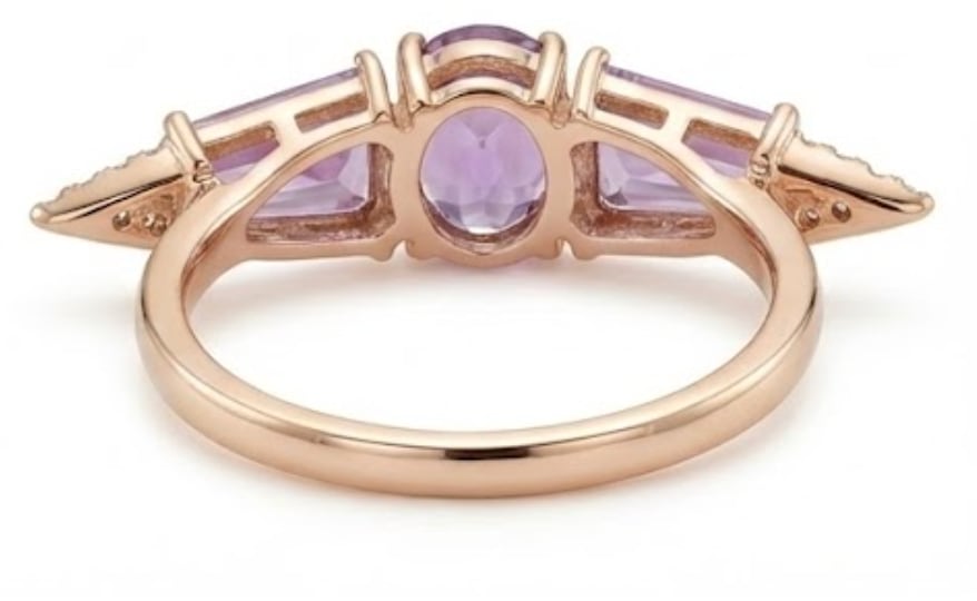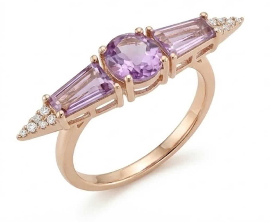 中央にはふっくらとしたオーバルカット、両サイドにはシャープな輝きを放つテーパーバケットカットのアメジストをセッティング。異なるカットが生み出す光のコントラストが、指先に奥行きを与えます。 両端にはダイヤモンド(計0.05ct)を添え、全体をK18ピンクゴールドの温かなラインで包み込みました。